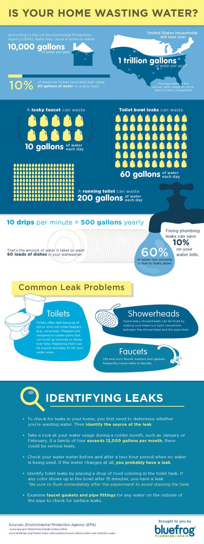 Did you know leaks may cause a home to waste roughly 10,000 gallons of water per year? That’s 1 trillion gallons of wasted water per year for United States households. It is important to be aware of common leak problems and how to identify them. Fixing plumbing leaks can save you roughly 10% on your water bill annually.